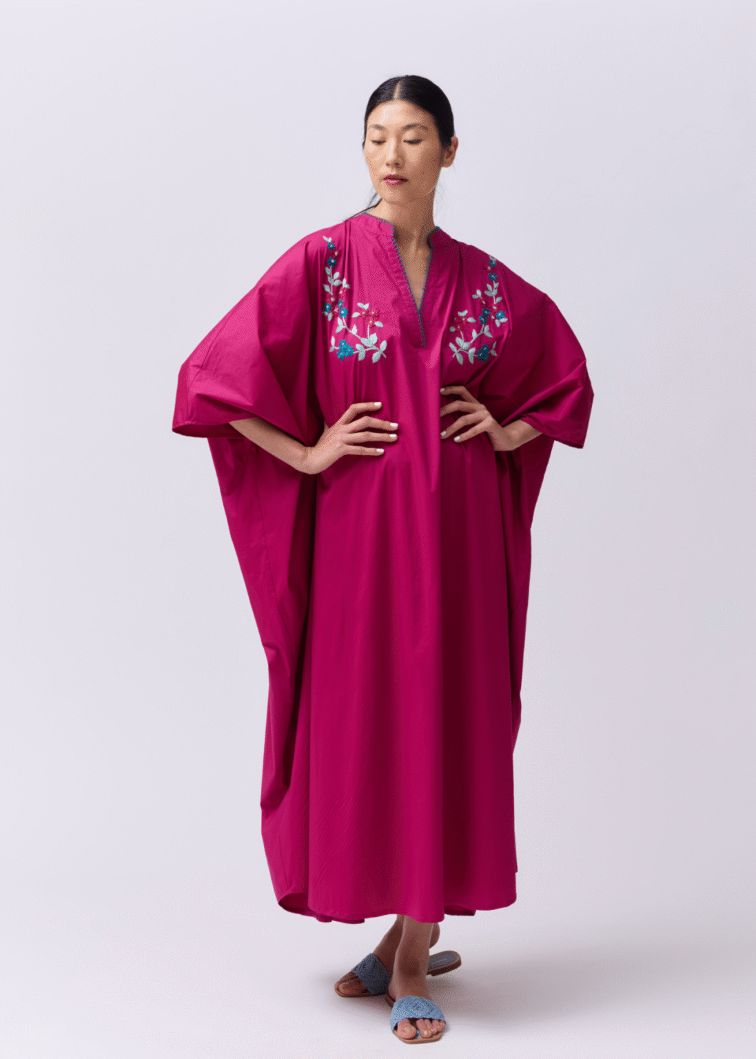 Crafted from lightweight cherry-colored poplin, this oversized kaftan features hand-embroidered floral accents in soft green tones across the bust. Its wide cut offers effortless comfort while celebrating artisanal craftsmanship.