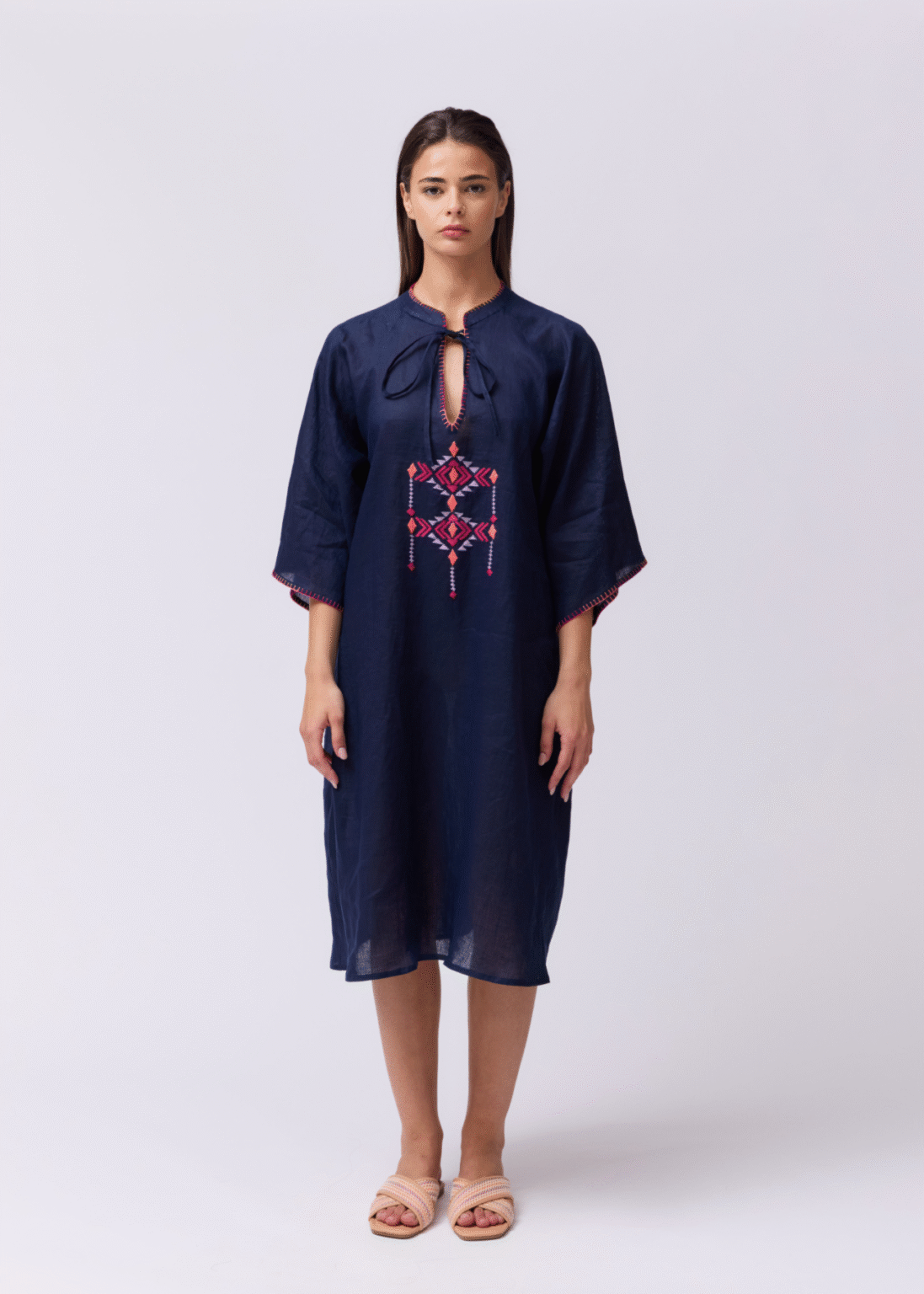 Crafted from deep midnight blue linen, this mid-length dress is adorned with intricate, hand-stitched Berber-inspired embroidery in shades of red, Indian pink, and soft lavender. Each motif tells a quiet story of tradition, reimagined through a feminine, modern silhouette.