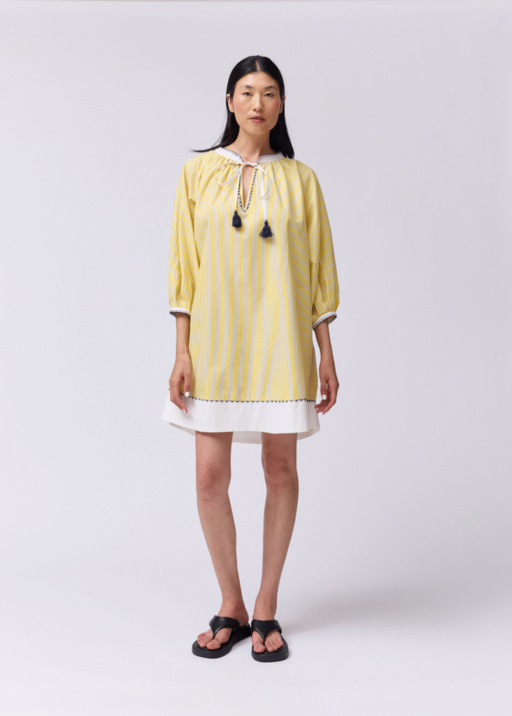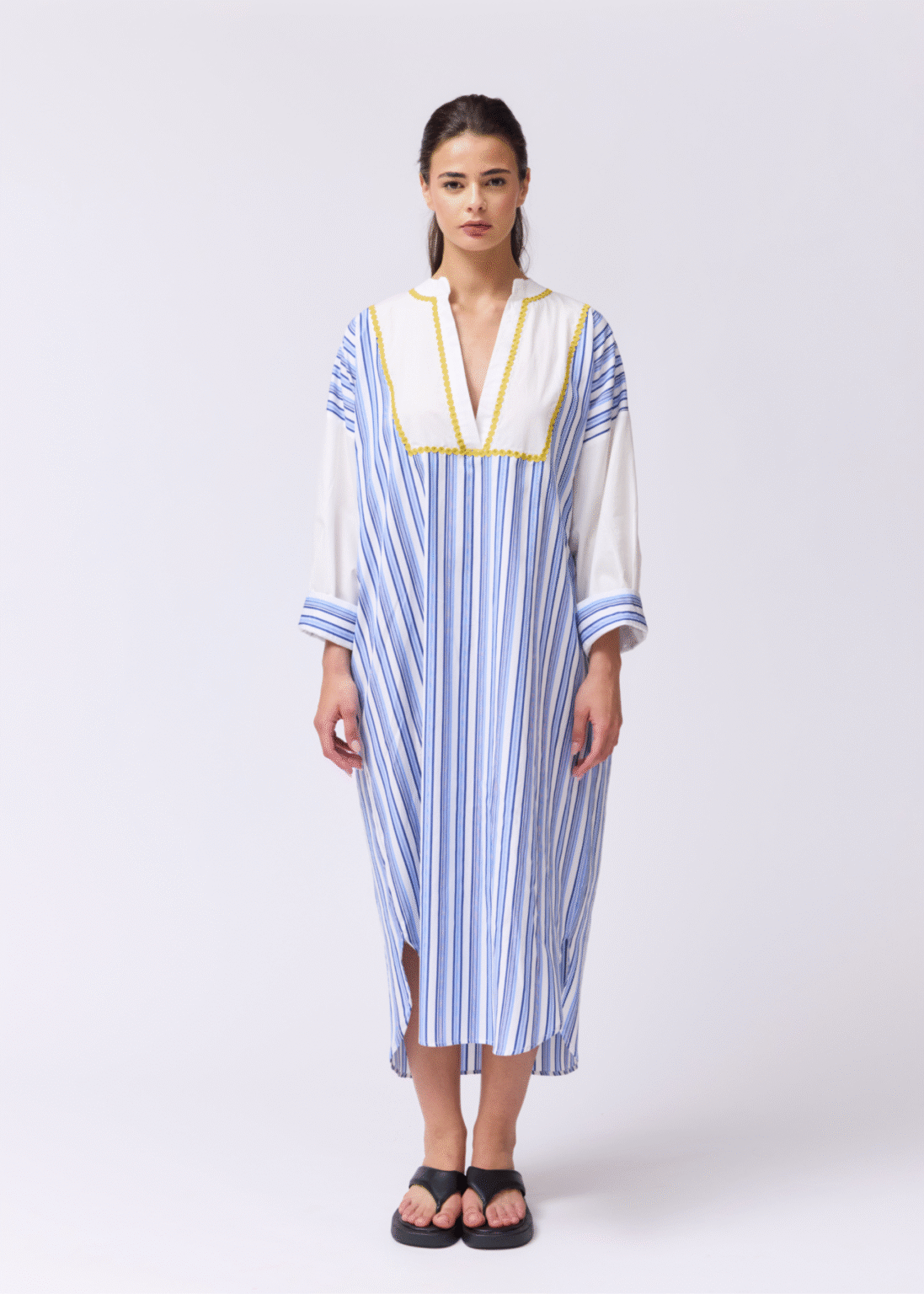 This long, oversized shirt dress is made from crisp blue and white striped poplin, offering an effortless and modern silhouette. The mandarin-style collar is delicately embroidered by hand with mustard-colored cord, adding a subtle but striking detail that elevates the whole piece.