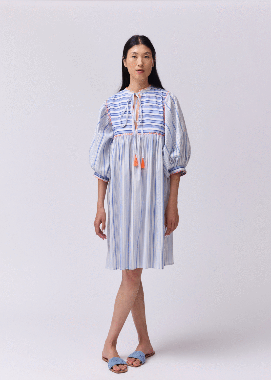 This unique dress is made from a patchwork of striped cotton poplin, artfully assembled for a fresh, dynamic look. The neckline is finished with striking fluorescent orange hand embroidery, adding a bold contrast to the soft, breathable fabric.