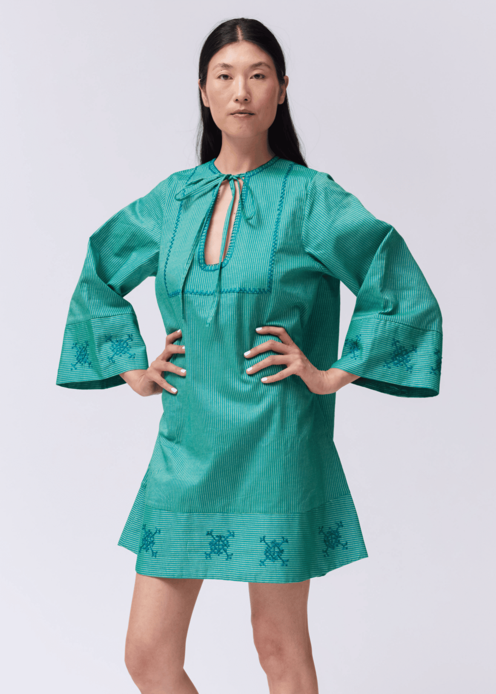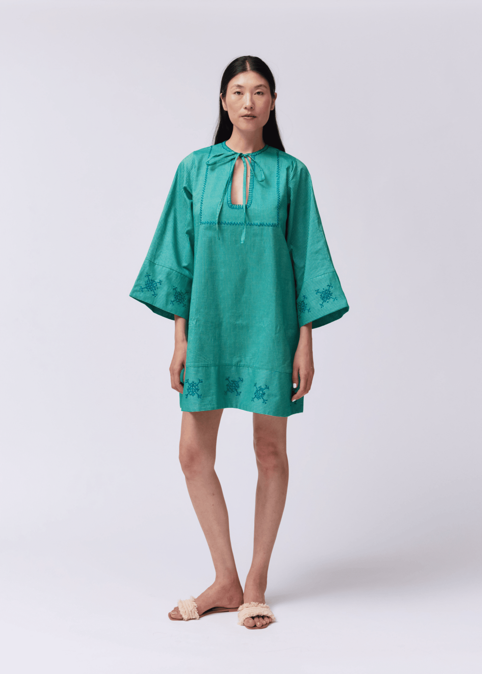 This short dress is made from breathable cotton poplin, featuring blue and green stripes that bring freshness and movement. Blue embroidery adds an artisanal finish, making it a refined yet easygoing piece for everyday elegance.