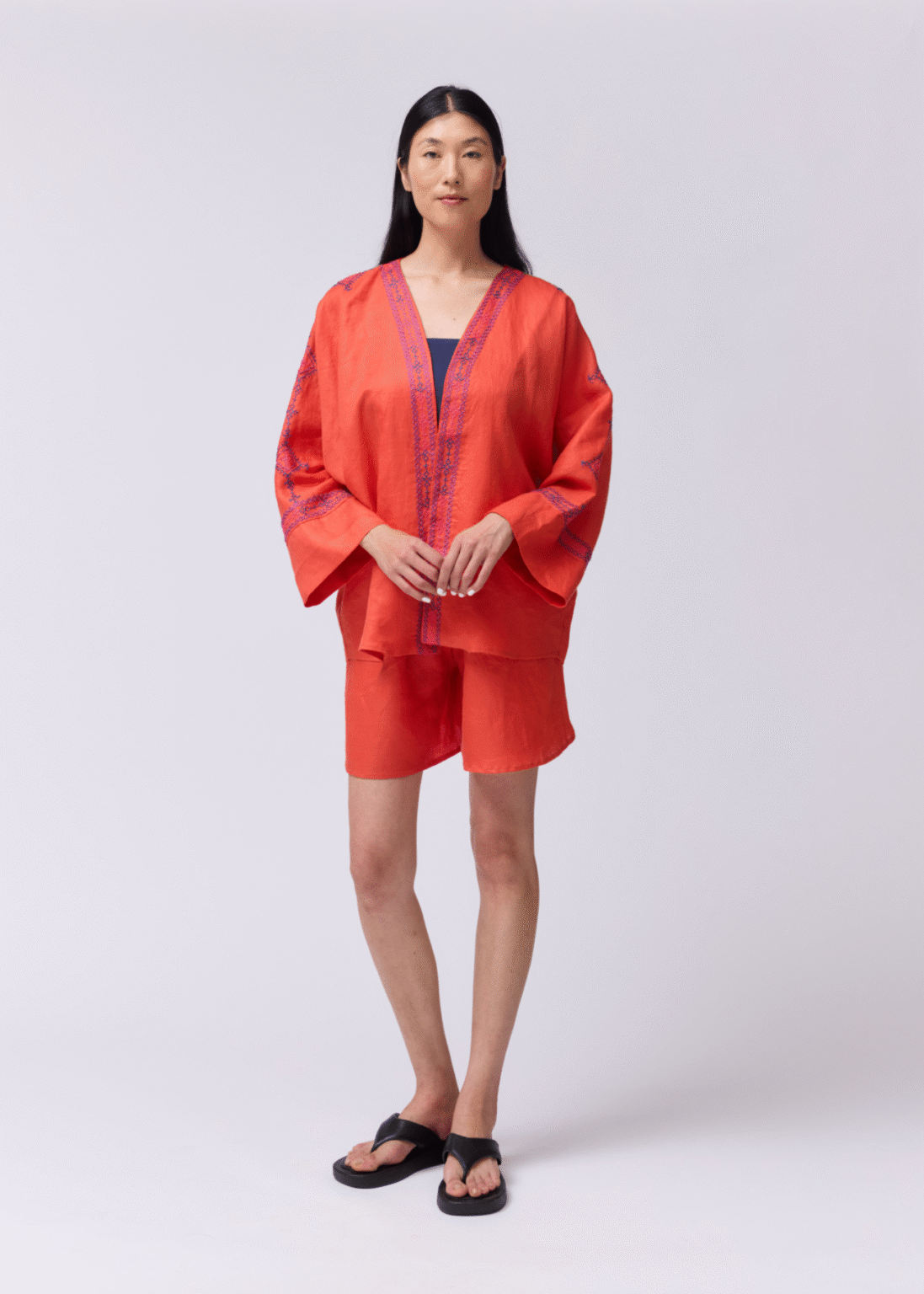 This short, wide-cut jacket is crafted from vibrant orange linen and adorned with hand embroidery in soft shades of pink, violet, and blue. Its relaxed fit and artisanal detailing make it a striking layer. perfect for styling over a dress or pairing with linen trousers for a modern, effortless look.