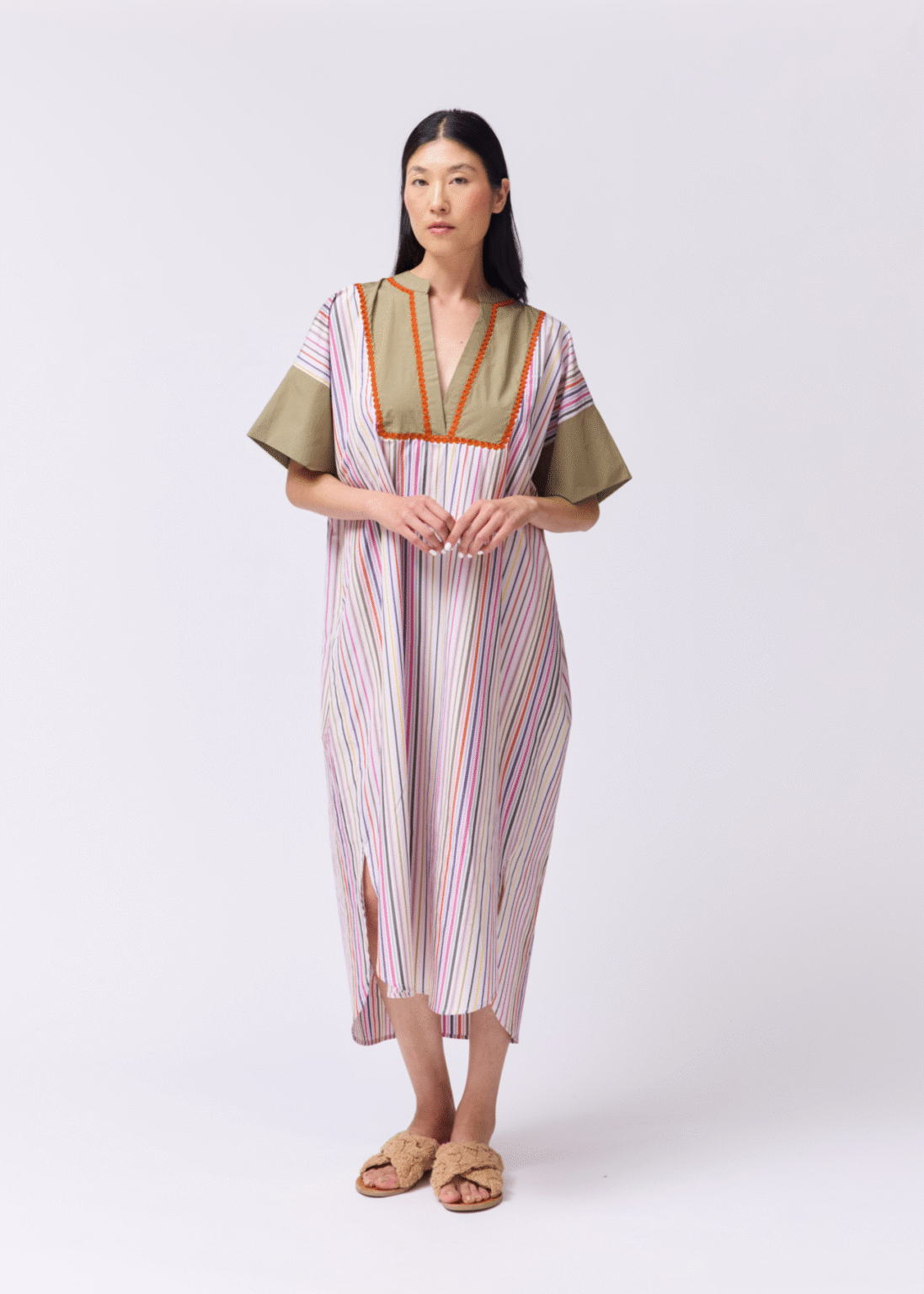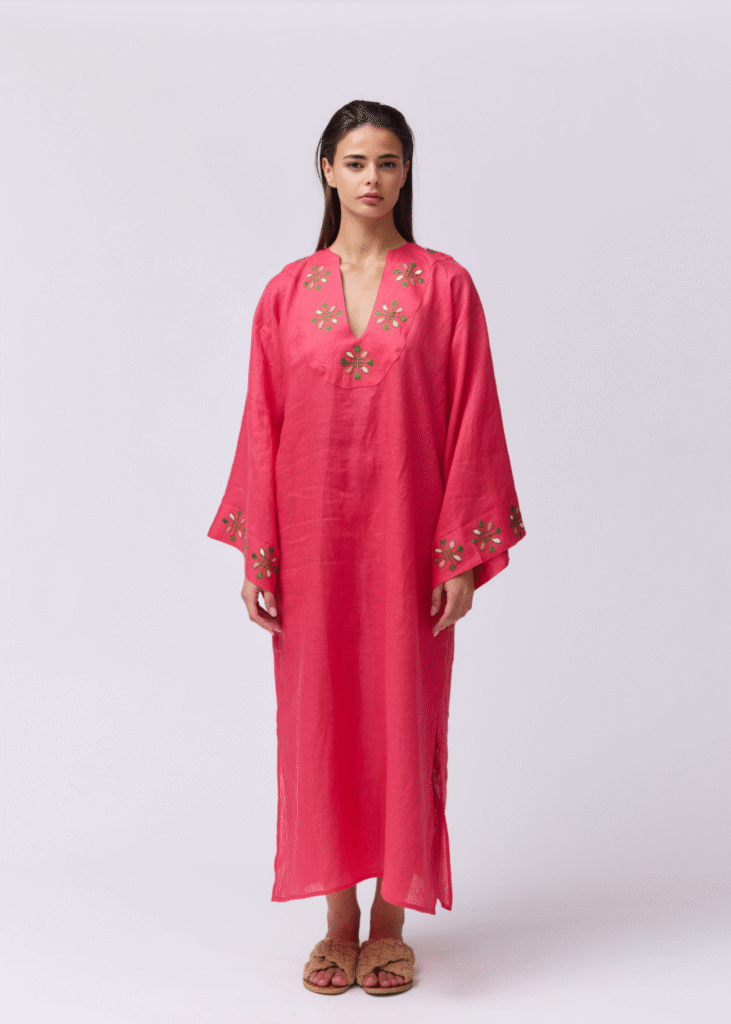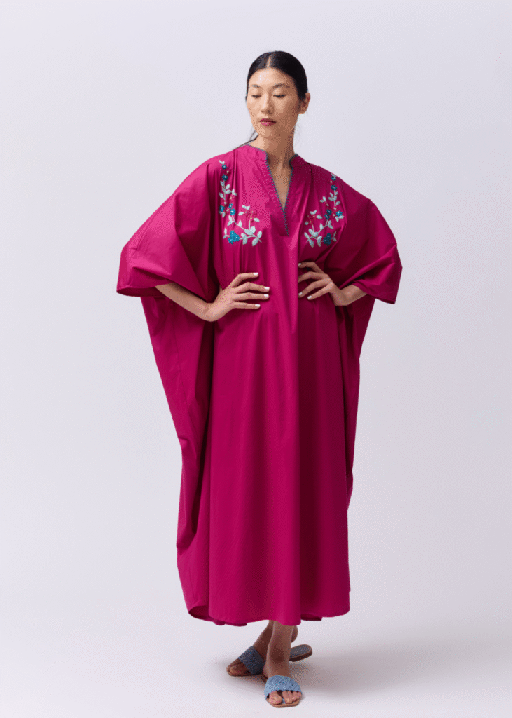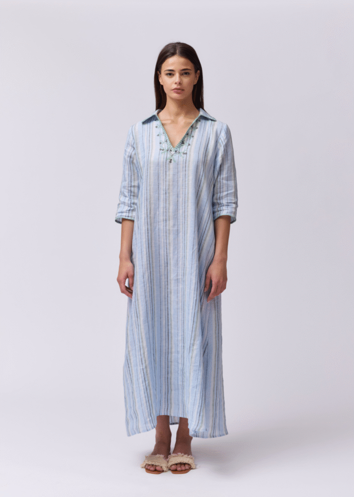This long shirt dress is made from soft striped poplin, featuring mid-length sleeves and a relaxed, flattering fit. Its defining detail lies in the hand-embroidered brick red cord that traces delicate patterns across the fabric, adding depth and artisanal charm.