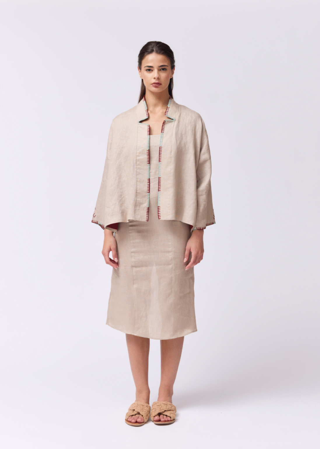 This short jacket, crafted from natural ecru linen, features intricate hand embroidery in deep green and brick red thread. The subtle contrast of colors highlights the artisanal craftsmanship while giving the piece a modern, effortless elegance. Versatile and lightweight, it pairs beautifully with a flowing dress or high-waisted trousers for a structured yet soft silhouette.